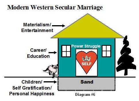 Slide6The Foundation. As illustrated in Diagram #6, according to this model, self-gratification and personal happiness rise to the top of the list of expectations for marriage.  Many people think that getting married will be their answer to personal happiness!  Too often however, within months, if not days, of saying “I do,” the husband and wife become disillusioned with the marriage when their spouse fails to meet all their needs and make them “happy.”  In some marriages children become the foundation when the couple attempts to find their fulfillment and purpose through their children.
